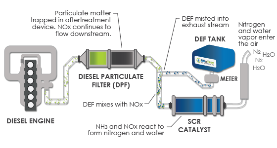 Diesel Exhaust Fluid (DEF) is misted into the diesel exhaust stream, downstream of the Diesel Particulate Filter (DPF). Sensors in the exhaust tell the DEF metering system what concentration of NOx is present in the exhaust stream, and meters the optimum amount of product required to neutralize the gas. The co-mingled exhaust-DEF solution then enters into the SCR Catalyst, where the DEF hydrolyzes into ammonia and reacts chemically with the NOx molecules present in the exhaust stream. The SCR catalyst allows the NOx and ammonia to break down and form two different compounds; harmless nitrogen gas and water vapour.